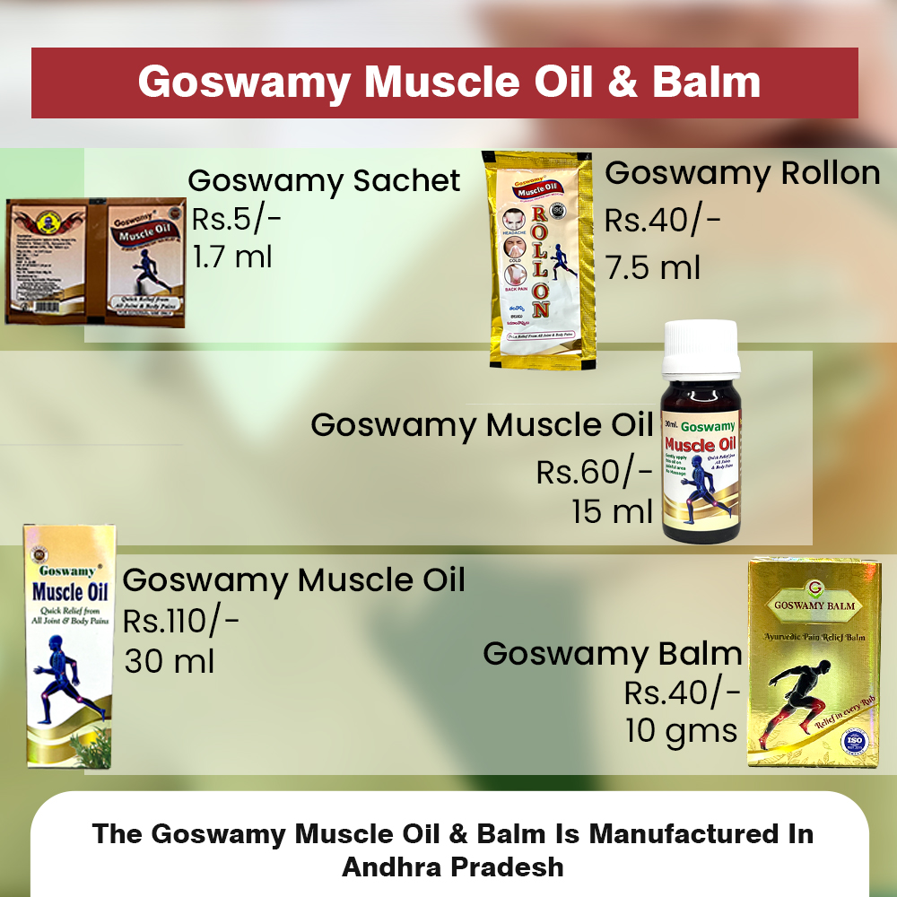 We are the manufactures of Ayurvedic Goswamy Muscle Oil Manufactures in India. Our Muscle oil not only target the symptoms but also manage the root cause of pain, promoting overall well-being. Our Muscle oil have minimal to no side effects, making them suitable for long-term use. Our oil get easily absorbed by the skin, providing fast relief to the affected area without leaving a greasy residue. The Goswamy Muscle oil is made for specific types of pain, ensuring that you get the right product for your needs.